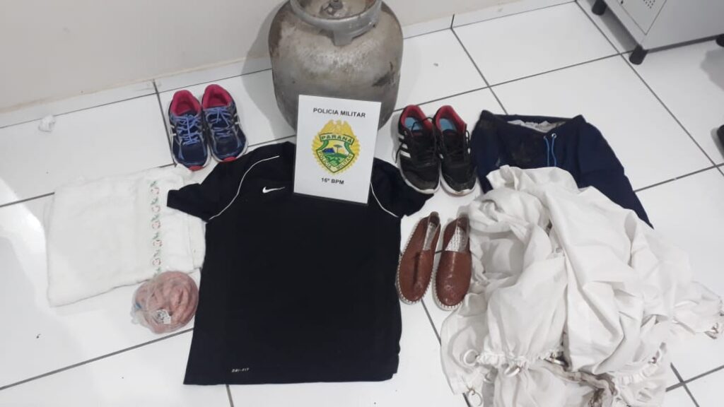 AO PERCEBER QUE A VIATURA SE APROXIMAVA O MESMO EMPREENDEU FUGA, ADENTRANDO UM LOTE BALDIO, NÃO SENDO LOCALIZADO, E ABANDONANDO O VOLUME QUE FOI CONSTATADO SER UMA CORTINA DE RESIDÊNCIA, NA COR BRANCA, DOIS PARES DE TÊNIS, UMA CAMISETA, UMA BERMUDA, UM QUILO DE LINGUIÇA E UMA TOALHA DE BANHO NA COR BRANCA.