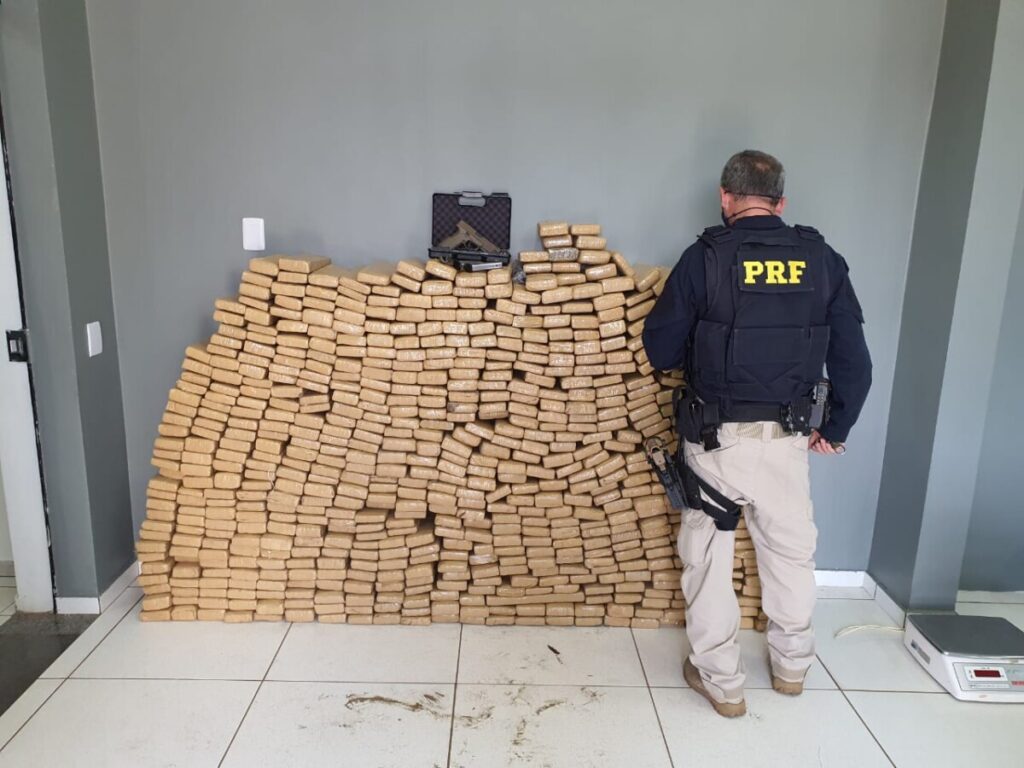 A Polícia Rodoviária Federal (PRF) apreendeu, na manhã desta sexta (23), 591,78 quilos de maconha e uma pistola 9 mm de origem croata, em Laranjeiras do Sul (PR). Traficante foi preso.