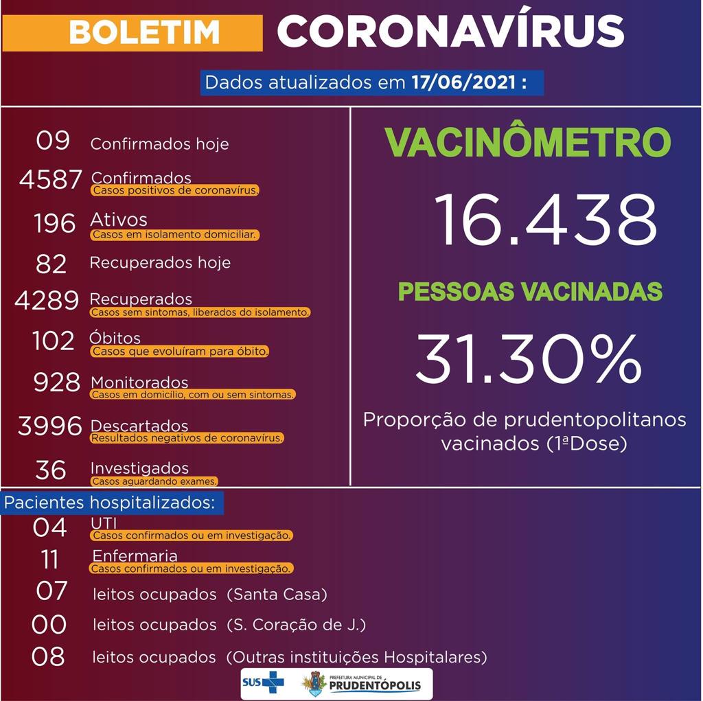 Na data de hoje, 17/06, foram confirmado mais 09 novos casos e 82 pacientes recuperados, 196 casos estão ativos e 36 pacientes estão aguardando resultados de exames em Prudentópolis.