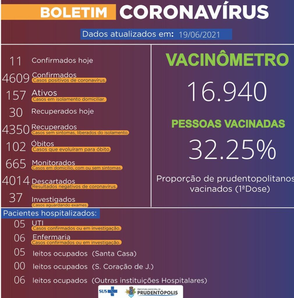 Na data de hoje, 19/06, foram confirmado mais 11 novos casos e 30 pacientes recuperados, 157 casos estão ativos e 37 pacientes estão aguardando resultados de exames em Prudentópolis. Atualmente, 11 pacientes estão internados, sendo 05 em UTI e 06 em enfermaria.