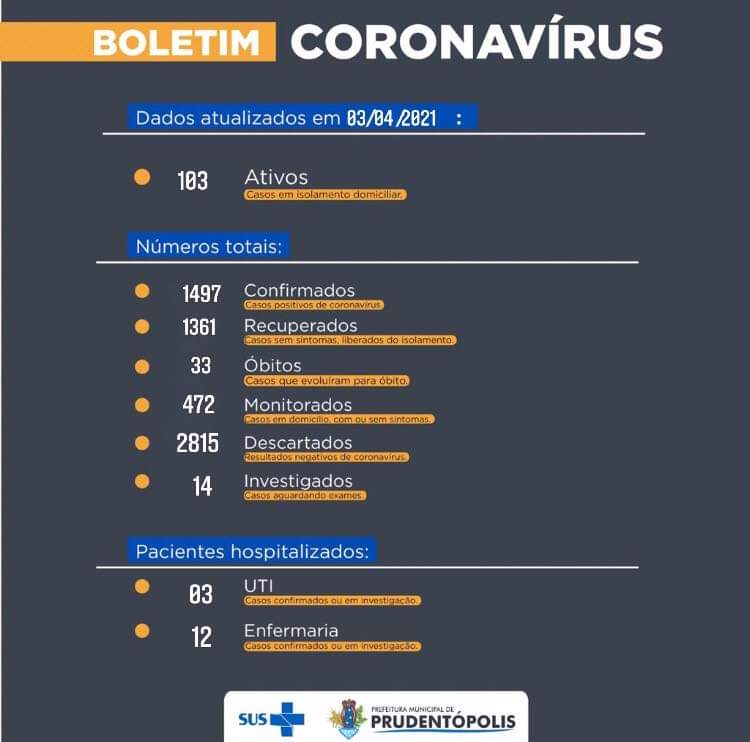 A Secretaria Municipal de Saúde vem comunicar que na data de hoje, foram confirmados 17 casos de Coronavírus, totalizando 1497 (mil quatrocentos e noventa e sete) casos confirmados.