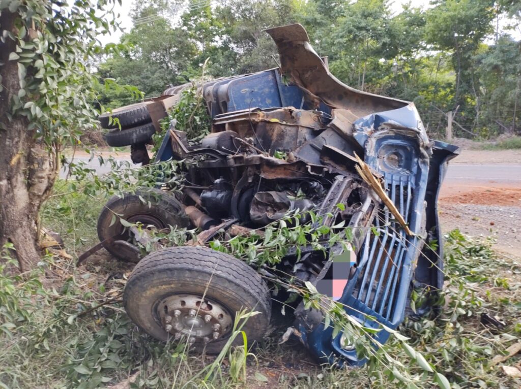 Com o impacto da batida a parte frontal do caminhão ficou totalmente destruído, o rodado da frente do veículo foi arrancado com o impacto contra a árvore.
