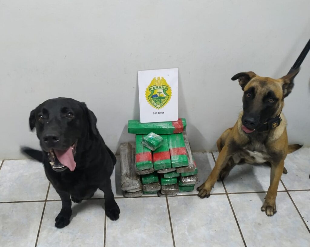 Hulk e Sherra em ação, cães da Polícia Militar localizaram drogas em um ônibus em Guarapuava.