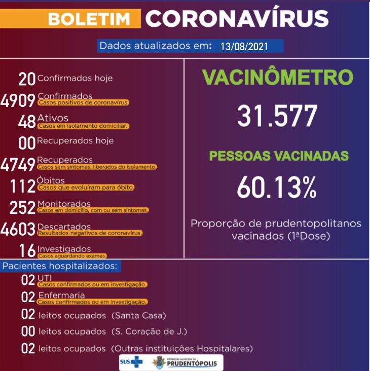 O VACINÔMETRO fechou a data de hoje com 31, 577 pessoas vacinadas que corresponde a 60. 15% de Prudentopolitanos vacinados com a 1ª dose.