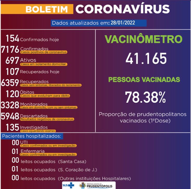 Na data de ontem, 28/01/2022, Prudentópolis confirmou mais 154 novos casos de Covid-19 e 107 pacientes recuperados. Até o momento, são 697 casos ativos, 3328 pessoas estão sendo monitoradas e 135 pessoas estão aguardando resultados de exames. Um paciente está internado em enfermaria.