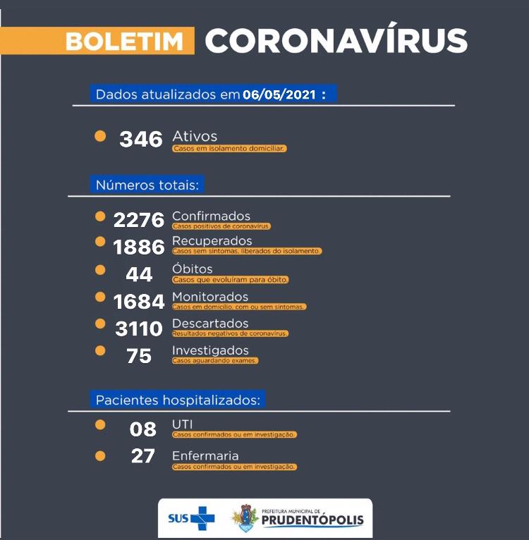 A Secretaria Municipal de Saúde vem comunicar que na data de hoje, foram confirmados 82 (oitenta e dois) casos de Coronavírus, totalizando 2276 (dois mil duzentos e setenta e seis) casos confirmados.